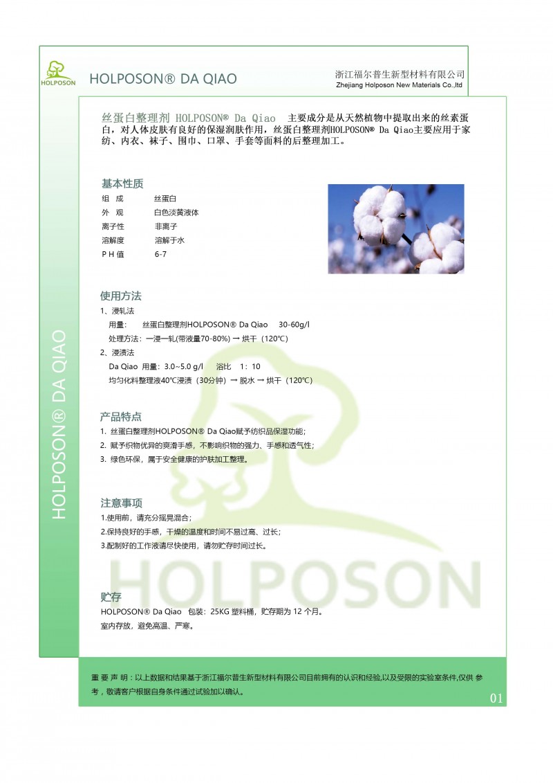 1. 丝蛋白整理剂HOLPOSON® Da Qiao赋予纺织品保湿功能;